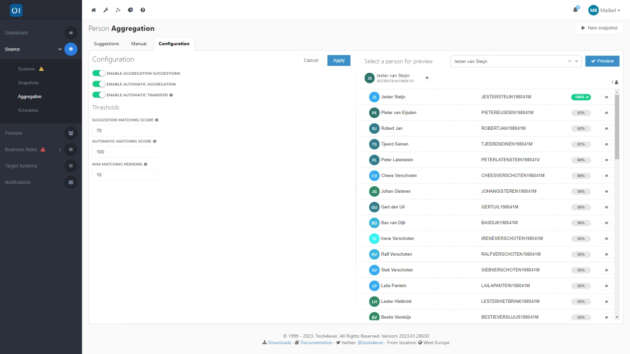 Another factor that determines whether HelloID executes suggestions automatically is the Automatic Matching Score. HelloID assesses the people for whom it proposes suggestions and assigns a score. HelloID executes the suggestion only if the score exceeds a configured threshold. You define this minimum score when configuring the aggregation capability. The Automatic Matching Score plays an important role in person aggregation and ensures that HelloID links accounts correctly even when spelling mistakes occur.