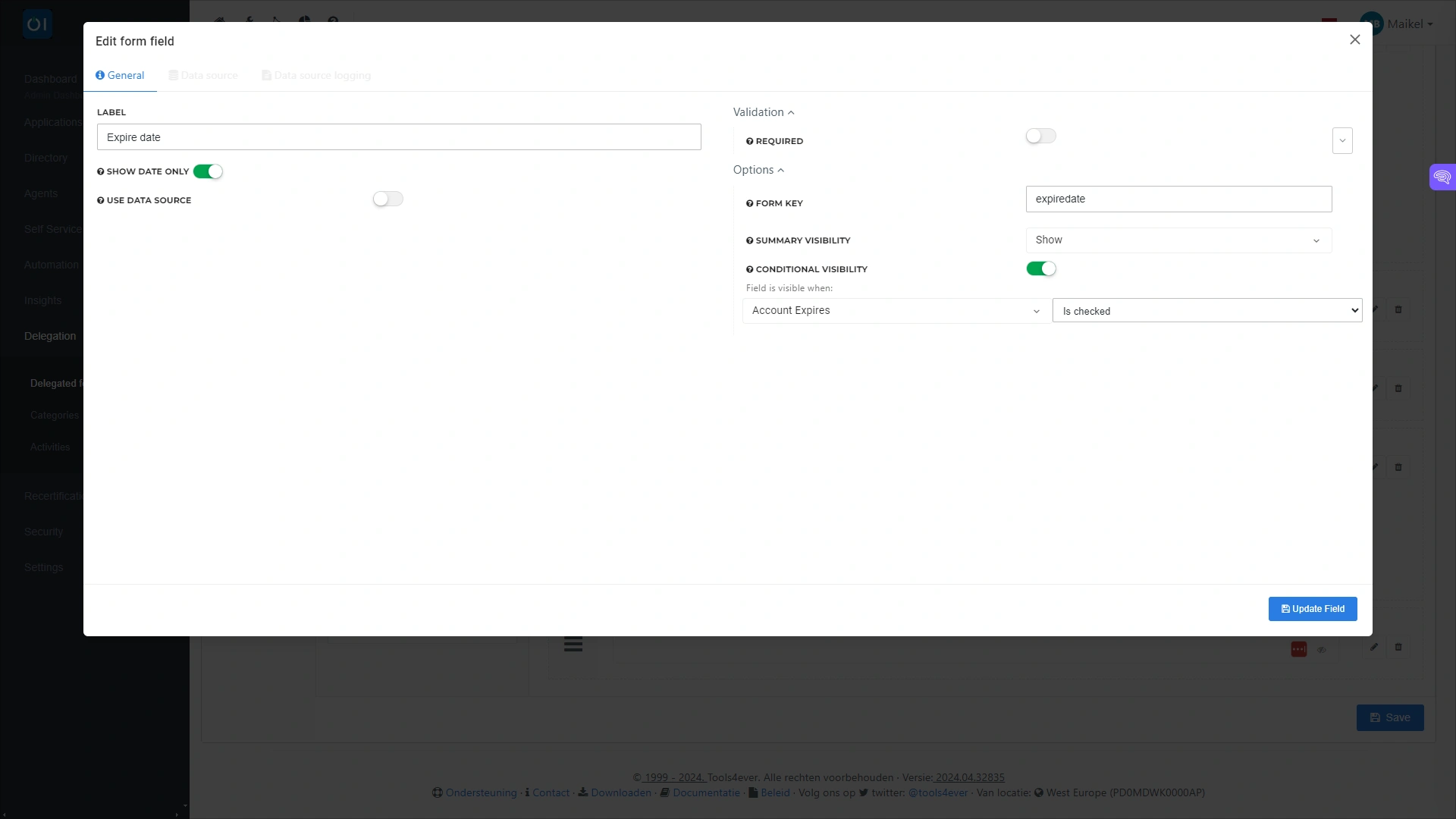 You can also make the display of a field conditional on specific input. This is relevant for the 'date picker', an element that allows users to enter a date and time on a Delegated Form. In the configuration of this element you can link the display of the date picker to specific conditions. This makes it possible to show the field only when the 'Account expired' option is set to 'True'. Or to show the field when the user selects a specific option on the form. In the configuration you also decide whether to require both date and time or only a date.