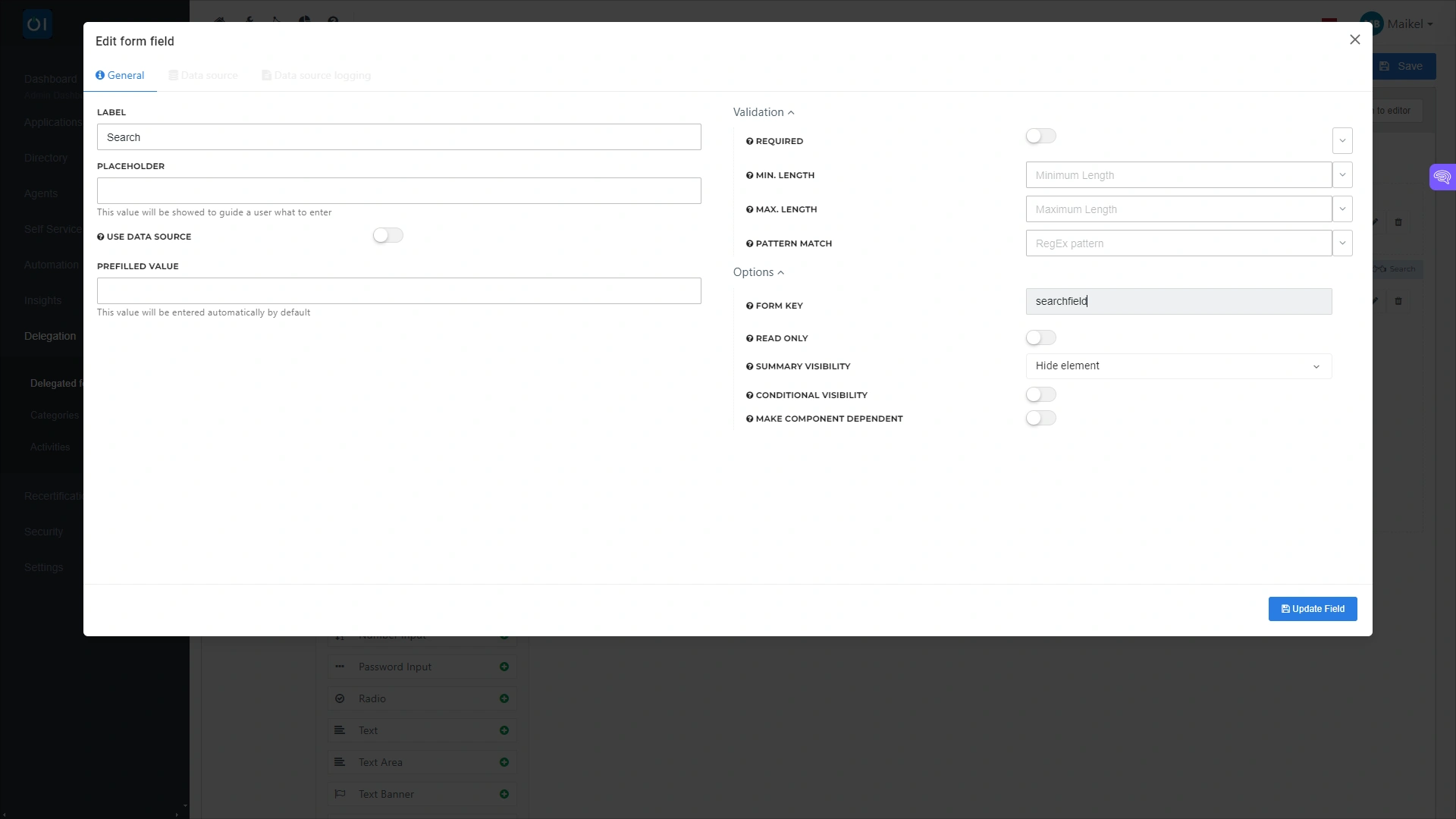 You can configure the different elements on a Delegated Form independently. This controls the behavior of the element as well as how it is displayed. For example, you can set a hint to help users identify the value they must enter in a specific field.
