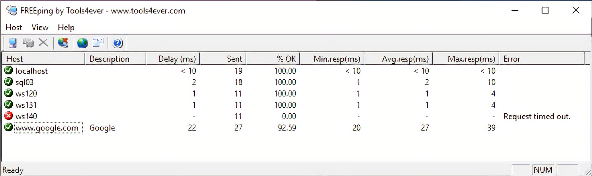 FREEping is a free networking tool that allows you to ping any number of IP addresses, host names, and websites at regular intervals. When a host stops responding, FREEping can send a popup message to a specified destination. This is a great utility for network and system administrators that we here at Tools4ever offer at no cost.